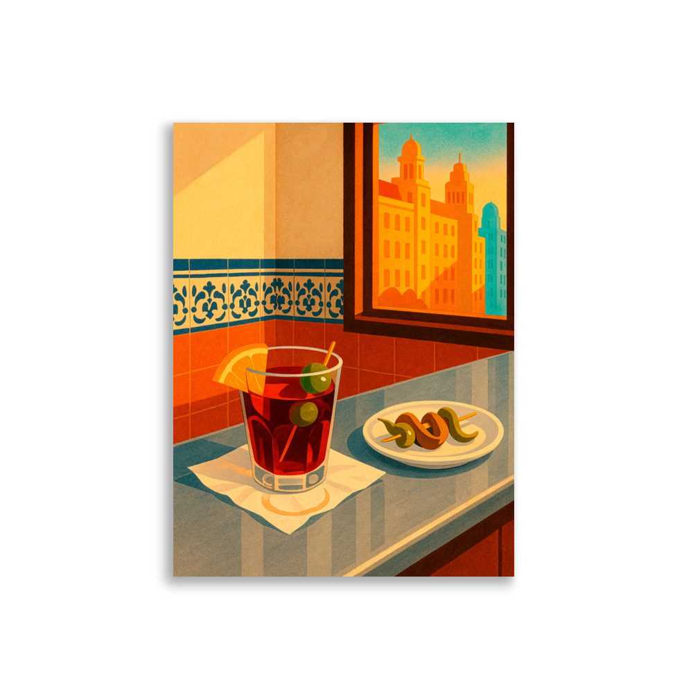 Cada trazo de esta obra captura la autenticidad madrileña: la celosía forjada de hierro típica de los balcones castizos, los edificios ocres bañados por la luz dorada del atardecer, y ese momento perfecto con un vaso de tinto (o vermut, ¡tú decides!) acompañado de unas gildas. Es Madrid sintiéndose en casa. Es nostalgia, es tradición, es vida.